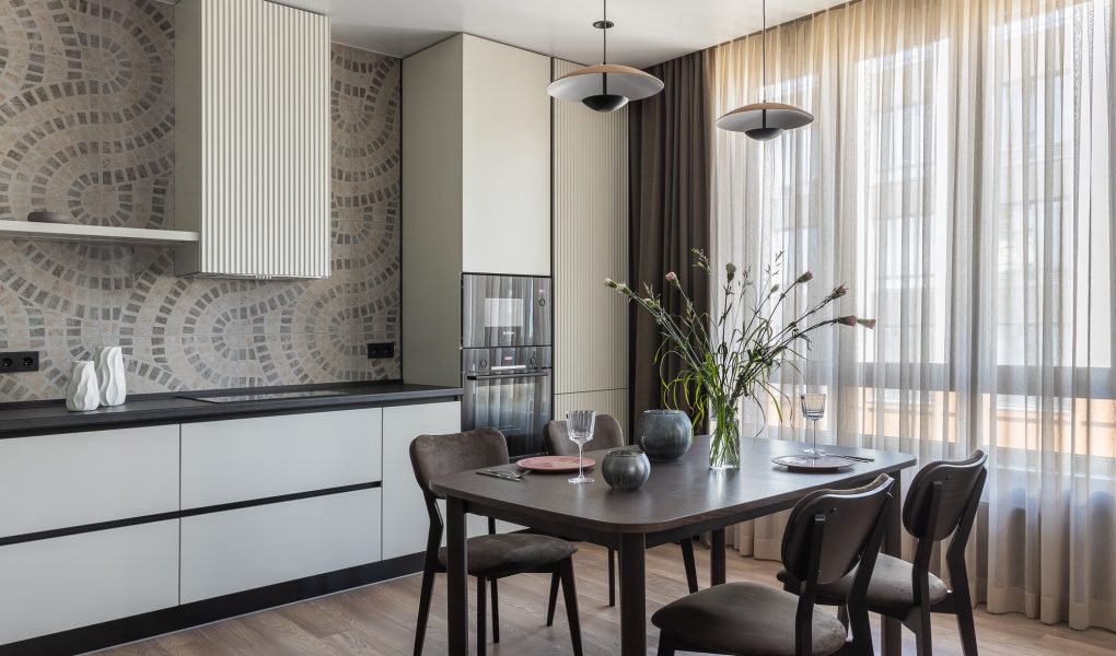 * **Определите зоны:** Использование напольных покрытий или ковров может помочь определить различные зоны в гостиной с кухней. Например, можно использовать ковер в обеденной зоне или под журнальным столиком в гостиной.