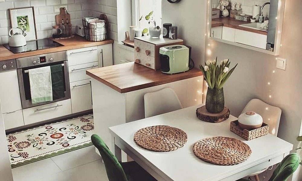 **Кухня в стиле бохо:** Используйте яркие цвета, этнические узоры и натуральные материалы, такие как дерево и плетение. Добавьте растения, марокканские фонари и плетеные корзины.