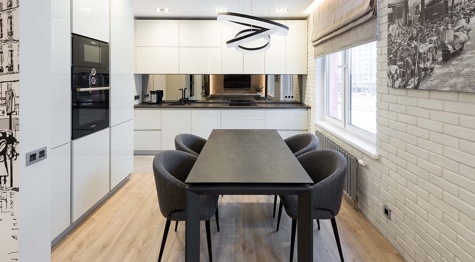 * Если кухня совмещена с гостиной, можно использовать раскладной стол, который позволит с комфортом разместить большое количество гостей.