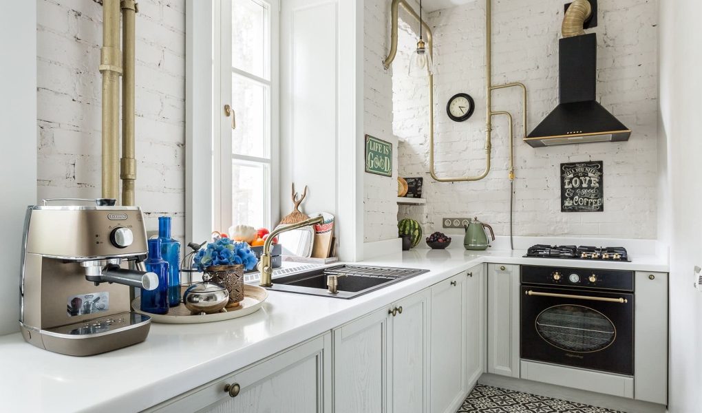 Трубы, особенно водопроводные и газовые, нередко омрачают интерьер кухни, особенно если он отличается оригинальным дизайном. Однако существуют различные способы, позволяющие аккуратно их замаскировать и сделать малозаметными.