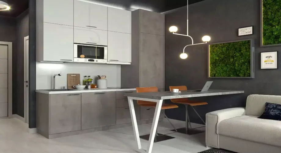 * **Однолинейная кухня:** Расположите все модули и технику вдоль одной стены, что позволит максимально использовать пространство и облегчит перемещение.