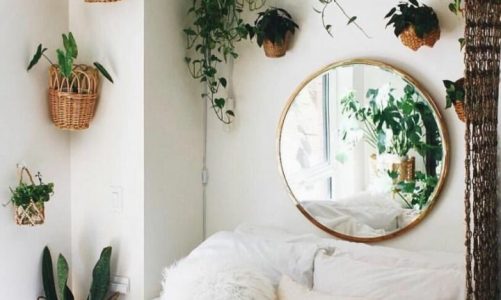 **Умиротворяющая природа:** Выберите темно-зеленые обои с рисунком тропических листьев в сочетании с натуральными деревянными элементами и растениями для создания успокаивающей и вдохновляющей атмосферы.