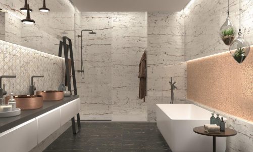 * **Под мрамор:** Плитка с прожилками, имитирующими мрамор, выглядит роскошно и элегантно.