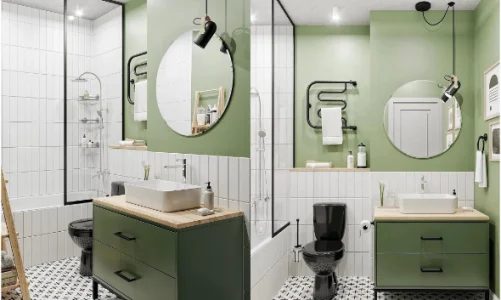 * Зеленый: Сочетание серого и зеленого создает ощущение свежести и гармонии. Оно идеально подходит для небольших ванных комнат.