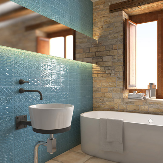 Голубая плитка для ванной комнаты может быть изготовлена из различных материалов, включая: