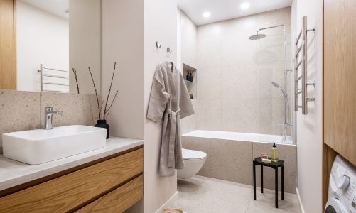 Выкладка плитки вертикально визуально приподнимает потолок, делая ванную комнату более высокой. Это решение отлично подходит для помещений с низкими потолками.