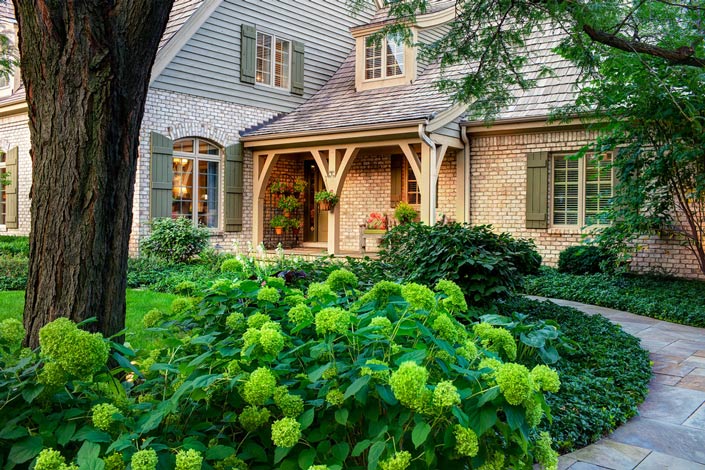 * **Кустарники и деревья:** Кустарники и деревья могут создать драматизм и структуру по всему фасаду. Располагайте их стратегически, чтобы обрамить входную дверь, выделить окна или создать живую изгородь.