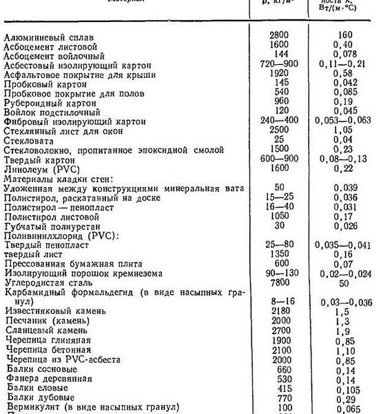 Ниже приводится таблица с удельной теплоемкостью некоторых распространенных строительных материалов: